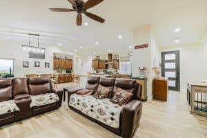 Built in 2020 by Merwin Homes, this stunning property offers the perfect place to call home-blending modern comfort, open living, and peaceful country charm on 10 fully fenced acres with breathtaking views. Step inside to a light-filled, open layout designed for both everyday living and gathering. The kitchen is the heart of the home, featuring a commercial-size refrigerator, cozy breakfast nook, and a spacious walk-in pantry. The living area flows seamlessly, creating a warm, inviting space to relax or entertain. The oversized primary suite is a private retreat with a soaking tub, walk-in shower, and generous walk-in closet. Two additional bedrooms share a full bath. A laundry room leads to a 1-car attached garage, while a separate 2-car attached garage is conveniently located off the secondary bedrooms. Outside, enjoy a covered patio and extended concrete space-perfect for quiet mornings or sunset views. The property is fully enclosed with 6-ft drill steel fencing for durability and security. A 60×40 barn with multiple access points, frost-free faucets, and 50 AMP service is ready for animals, hobbies, or storage. A shed, hitching post, and hot tub complete the property.
